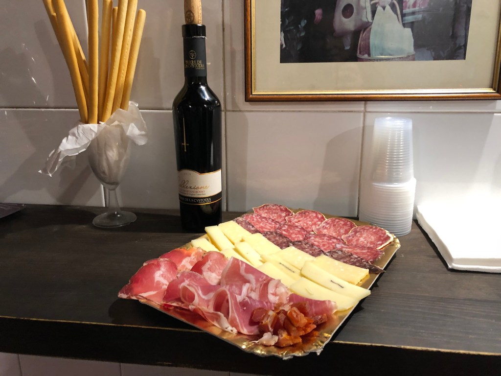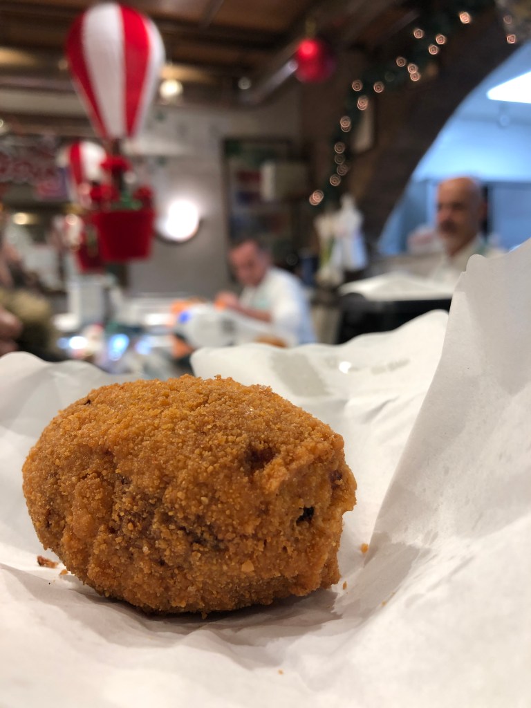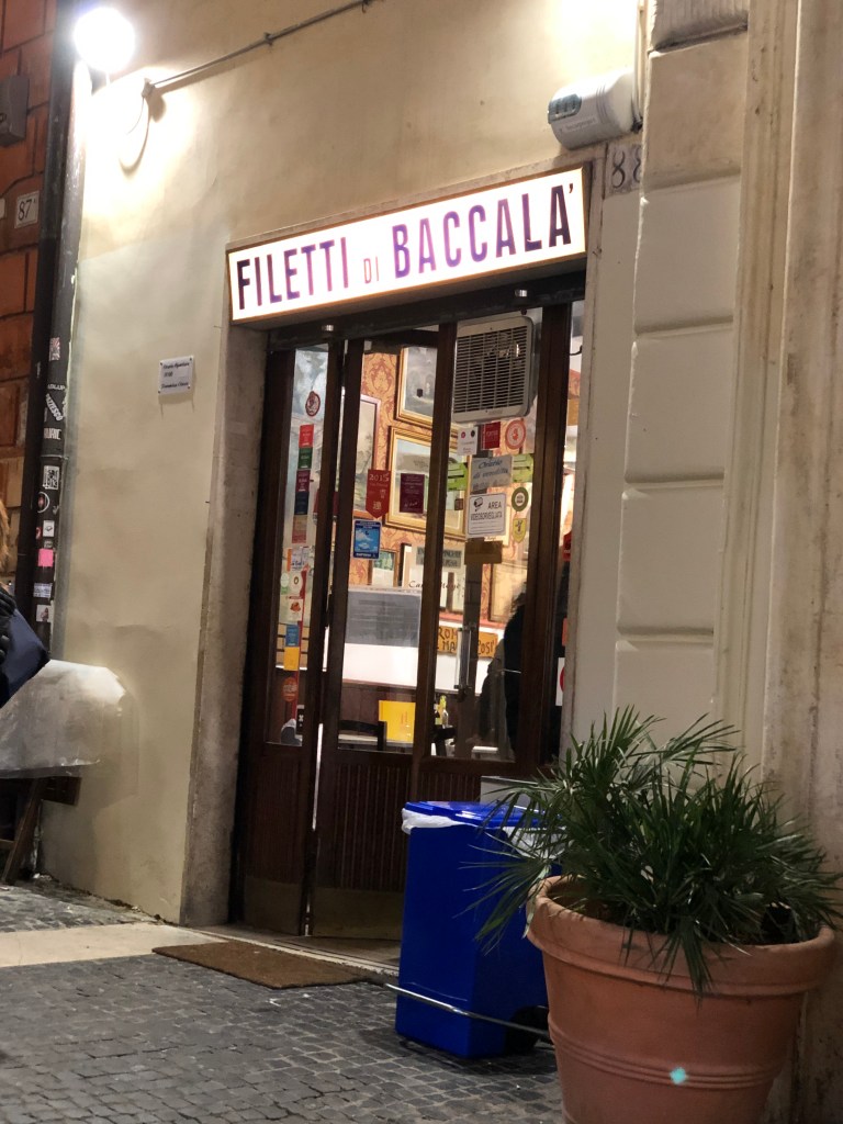 After meeting up with our guide, Francesca, and the two other guests, we set out for what would be a night of food, drinks, fun, and, well, more food! We journeyed to eight different stops, each serving us a unique piece of Roman culture. Out of everywhere we stopped, Dar Filettaro and Ristorante Impiccetta particularly resonated with me. Why? At Dar Filettaro, we each got a fried Cod fish fillet; something so tasty and distinct to this one little shop (so we were told!).