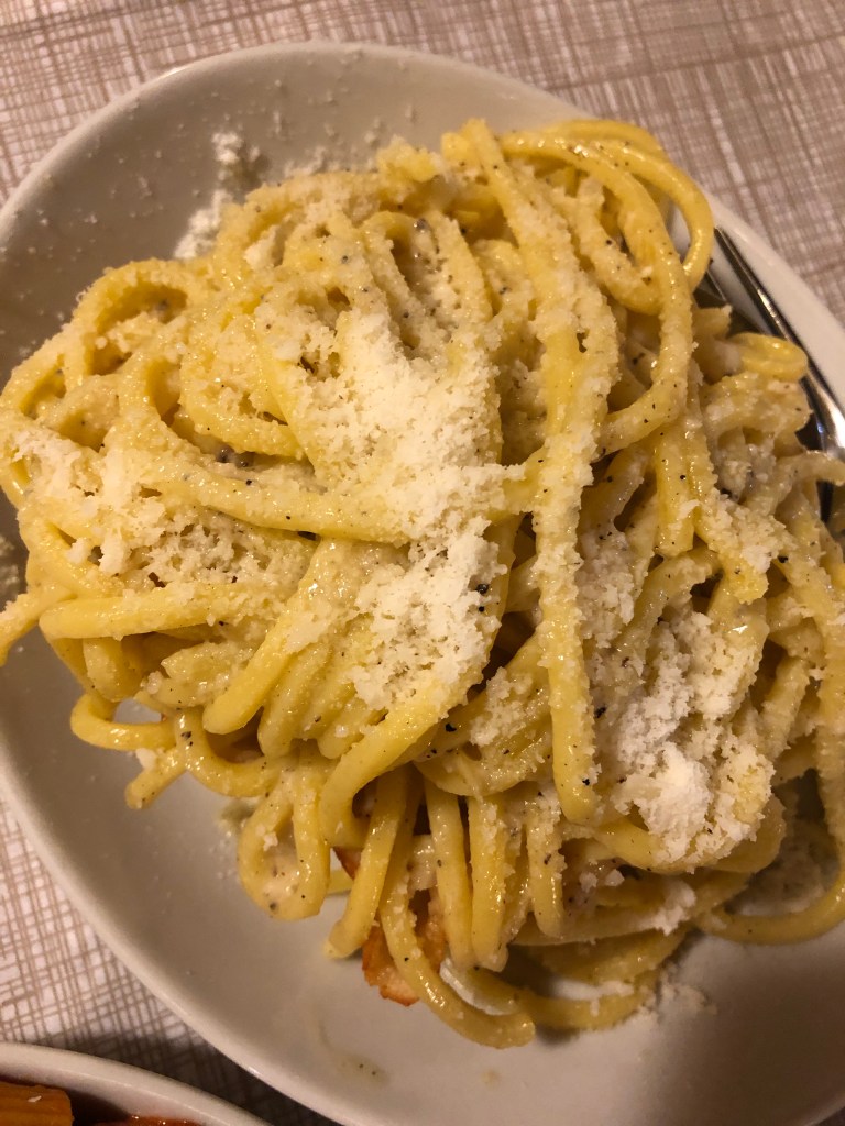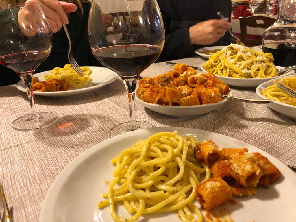 As the seventh stop, we were not expecting to sit down for a full meal at Ristorante Impiccetta, which was such a pleasant surprise! The small, authentic, off-the-beaten path restaurant brought us out wine, bread, and three different types of pasta: cacio e pepe, carbonara, and amatriciana: three specific dishes that I was dying to try!