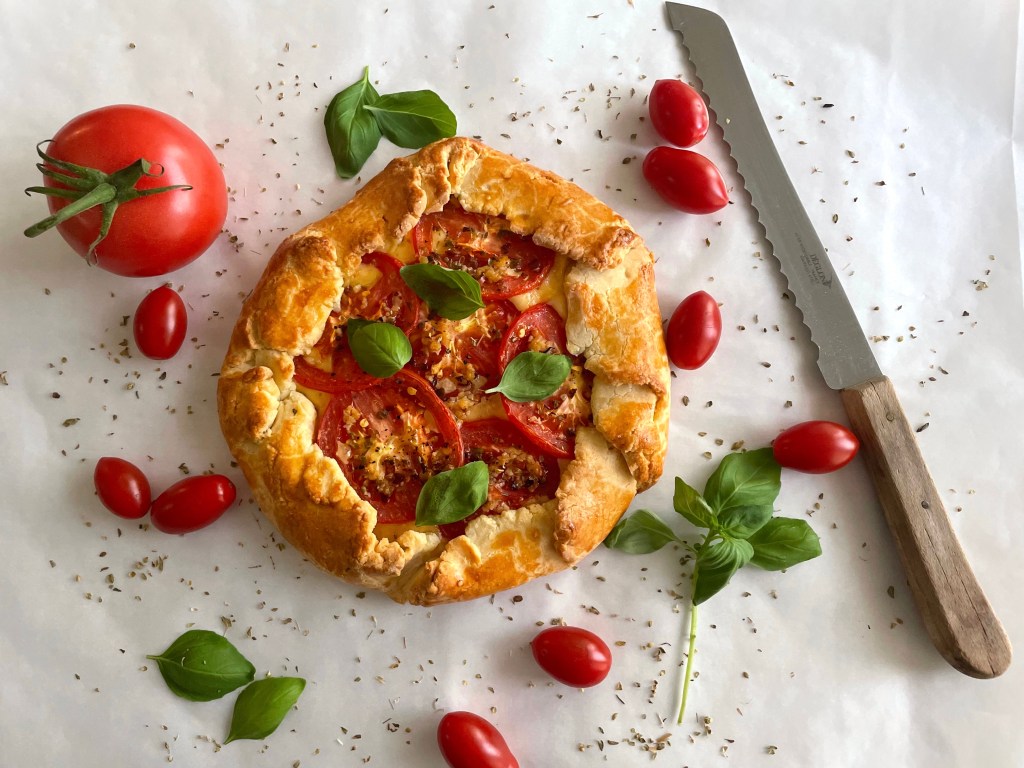 - 2. Pat tomato slices dry with a paper towel. Scatter shredded cheese over crust, leaving a 2” border. Arrange tomatoes on top and sprinkle with minced garlic, red pepper flakes, salt, pepper, and dried oregano. Drizzle with olive oil.
