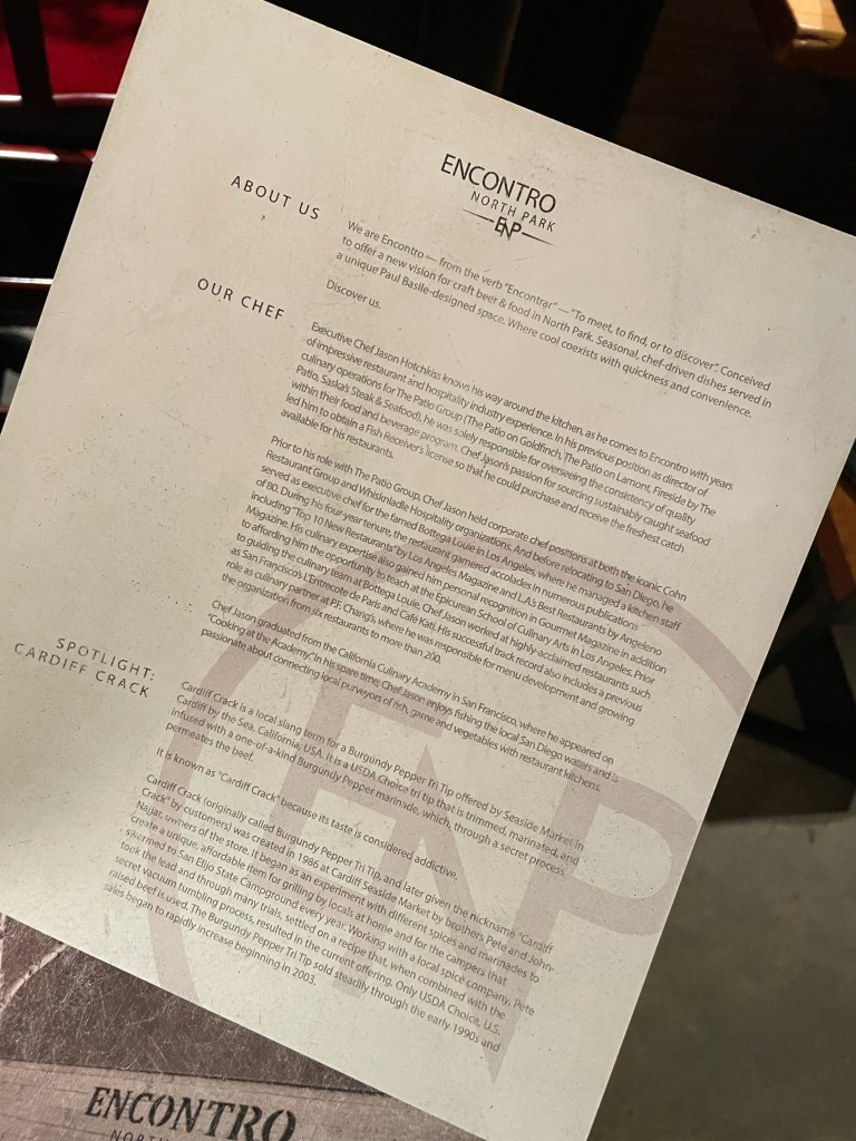 Flash back to the COVID era when vacations were pretty much a term of the past. Come 2021, a brief period of relaxed “lock-down” allowed our family of 6 a chance to escape our little hometown of Yorba Linda to get away together for a couple nights down in San Diego. Looking for somewhere fun with a diverse menu to dine for dinner one night that was still open, we found Encontro nearby to our AirB&B with a Google Business page full of delicious-looking photos and great reviews. We collectively made the decision to give it a try. Now flash forward to 2024- 3 years later. Anyone that mentions San Diego, I immediately recommend Encontro – that is how memorable the night was back in 2021. Not only was the food FABULOUS, but the service and vibe of the place really stuck out to me. It felt like somewhere that I was more than a “paying customer”- it felt like I was part of a family and being served dinner at a family gathering. With the bonus of unforgettably delectable dishes and drinks.